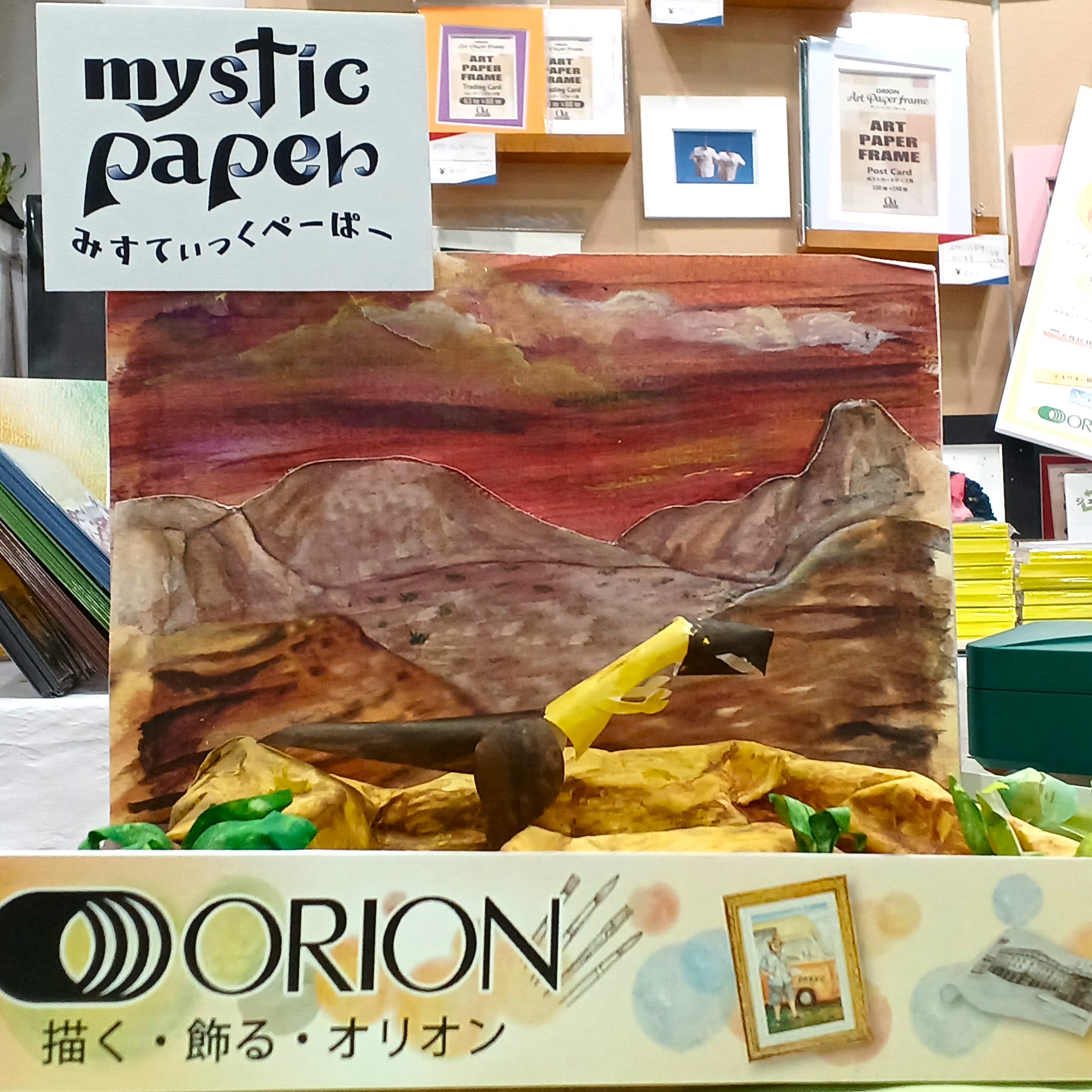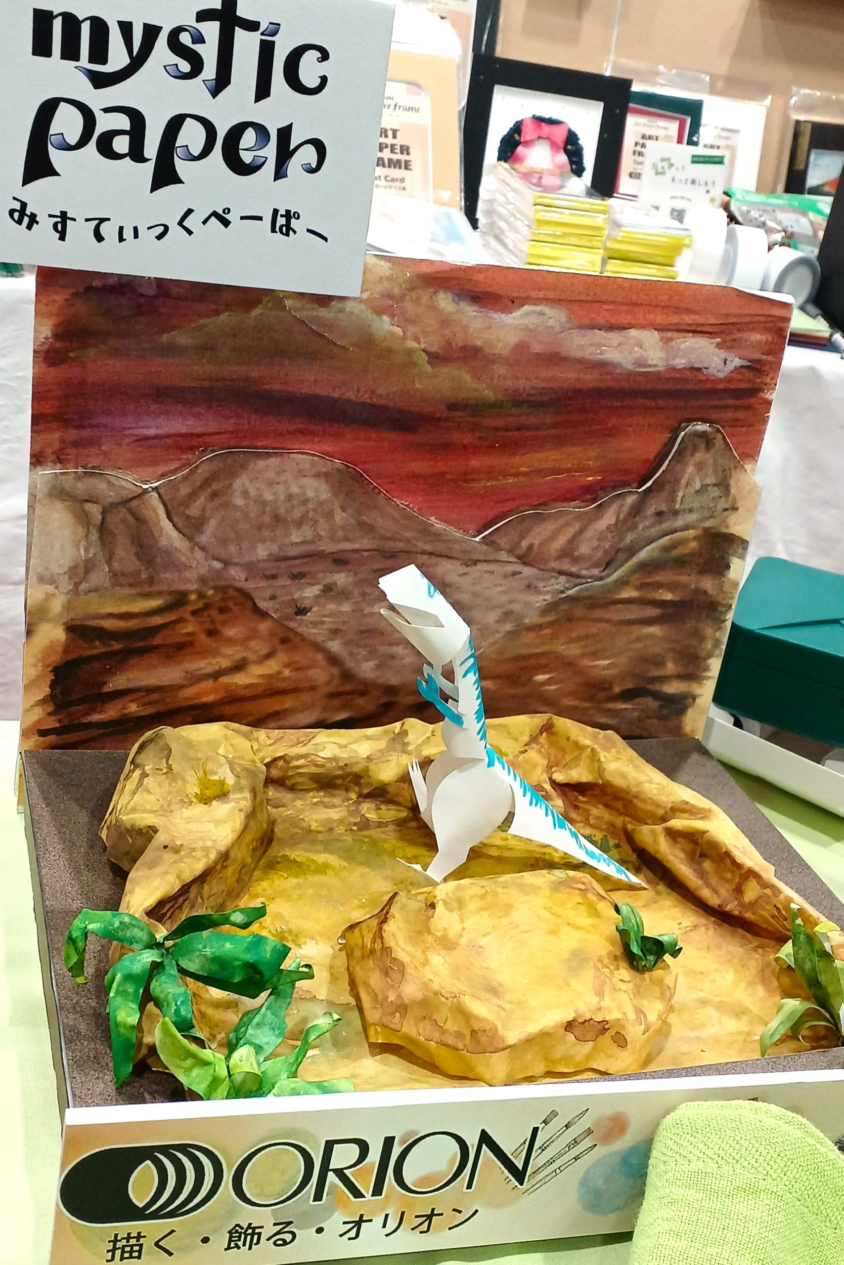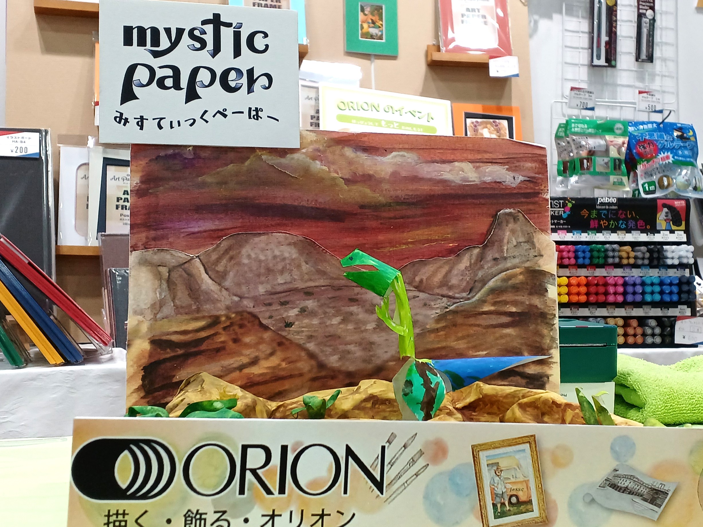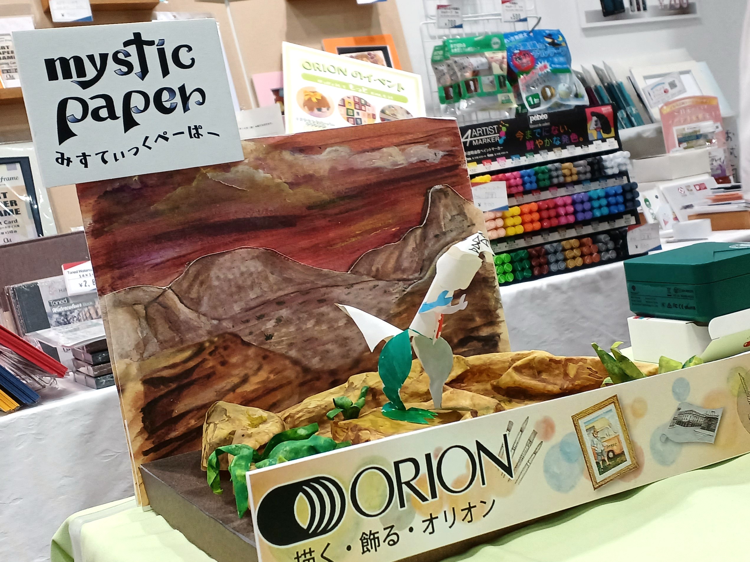 オリオンブースでは、マットボードやギルディングワックスなど、立体制作に役立つ品物を厳選してお試し&販売しました。中でも特に”ミスティックペーパー”にご興味を持ってくださる方が多くいらっしゃいました。ミスティックペーパーは、紙ならではの良さと、固まったときの固さを兼ね備えた、表現の幅がとても広いユニークな素材です。