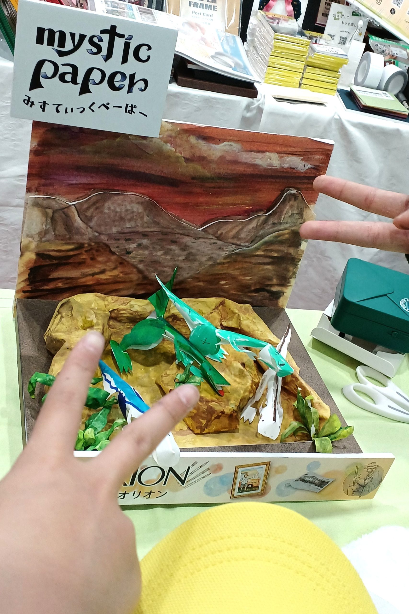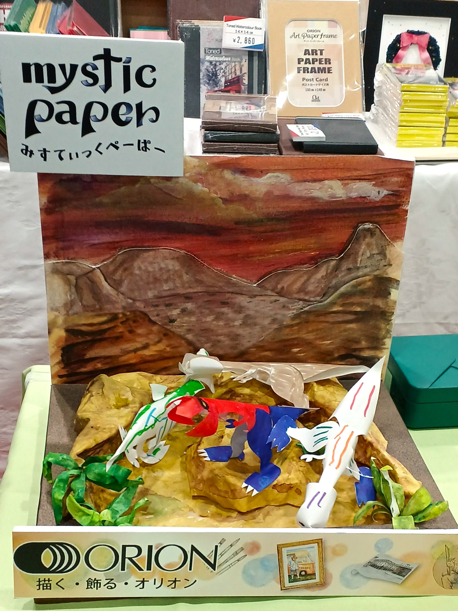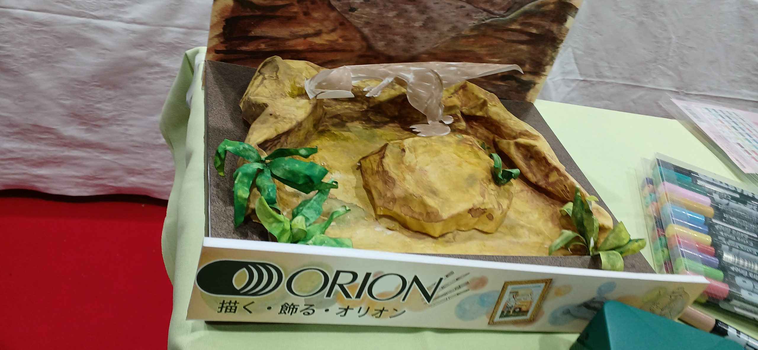 オリオンブースでは、マットボードやギルディングワックスなど、立体制作に役立つ品物を厳選してお試し&販売しました。中でも特に”ミスティックペーパー”にご興味を持ってくださる方が多くいらっしゃいました。ミスティックペーパーは、紙ならではの良さと、固まったときの固さを兼ね備えた、表現の幅がとても広いユニークな素材です。