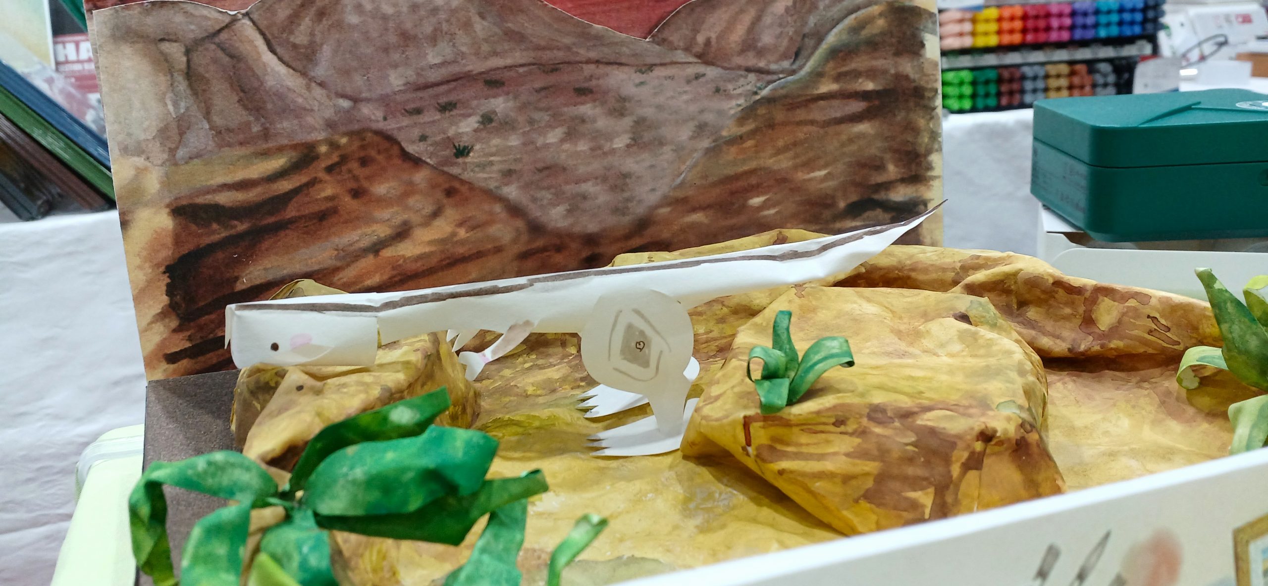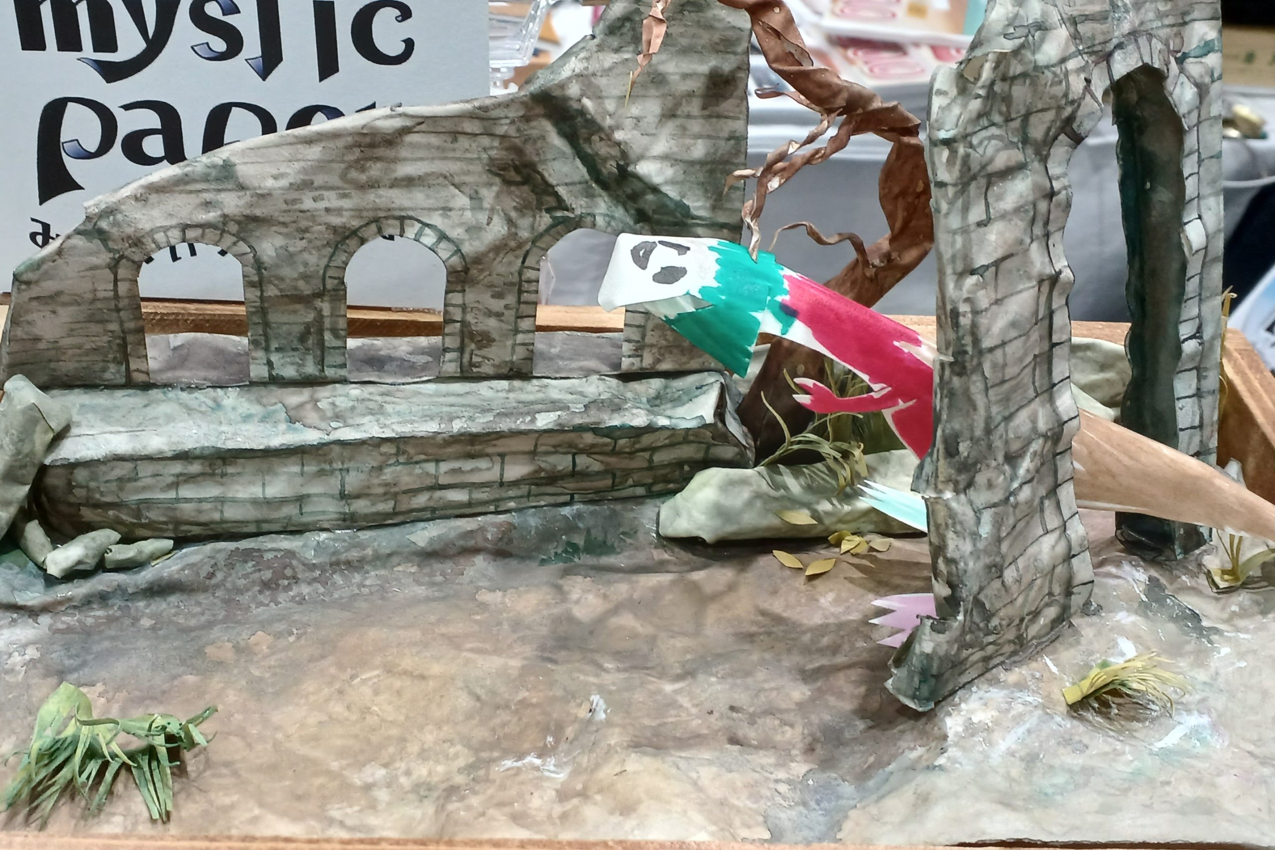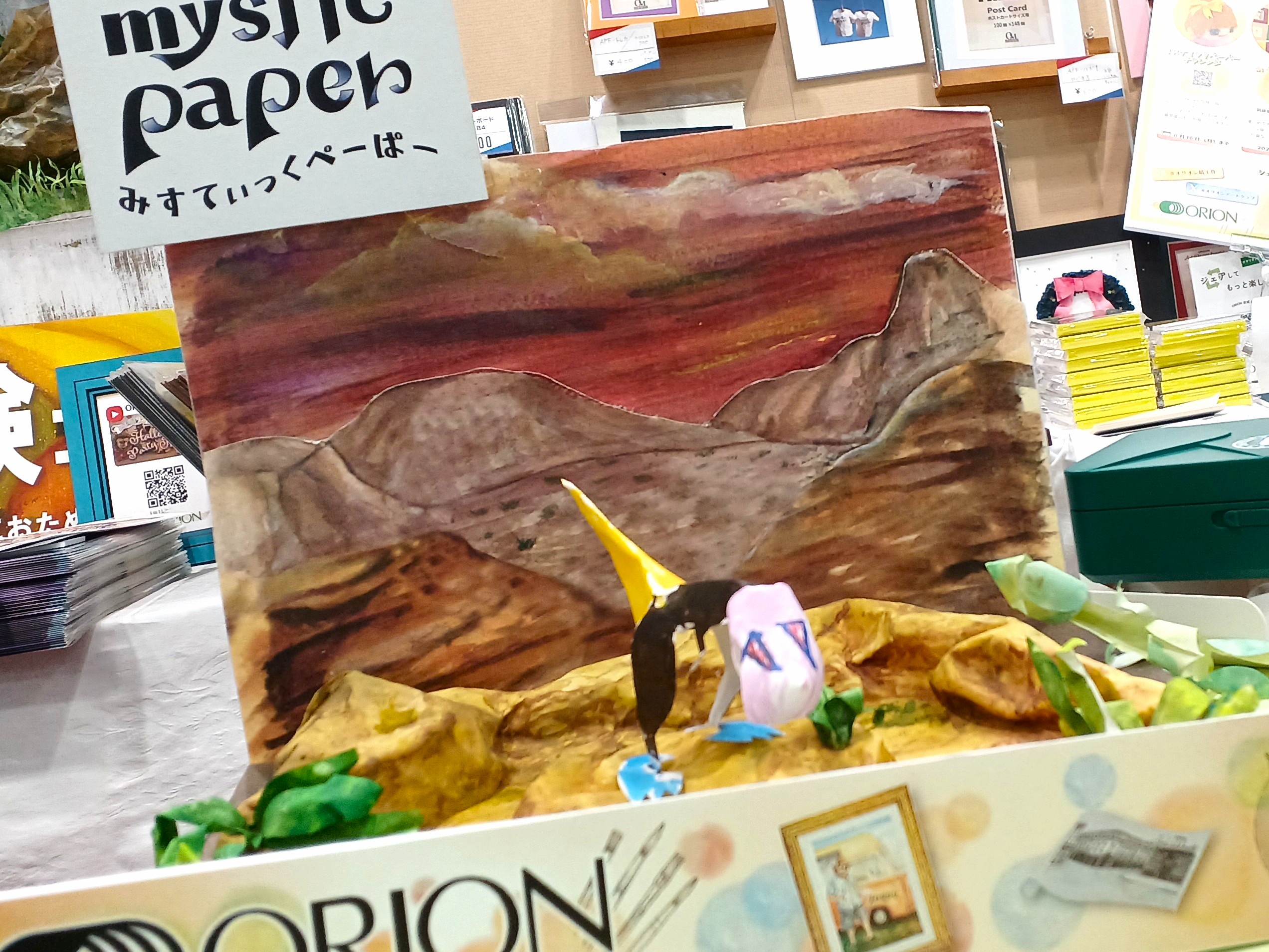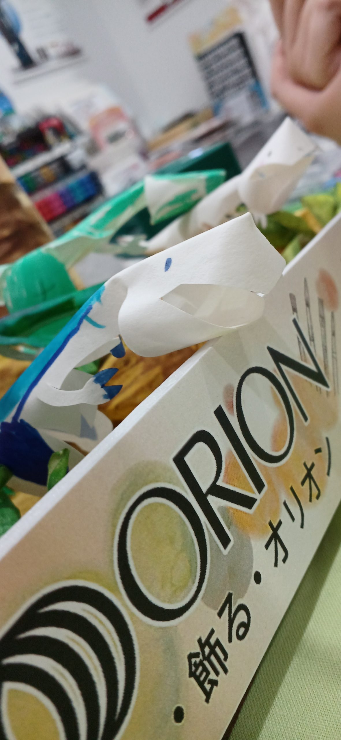 オリオンブースでは、マットボードやギルディングワックスなど、立体制作に役立つ品物を厳選してお試し&販売しました。中でも特に”ミスティックペーパー”にご興味を持ってくださる方が多くいらっしゃいました。ミスティックペーパーは、紙ならではの良さと、固まったときの固さを兼ね備えた、表現の幅がとても広いユニークな素材です。