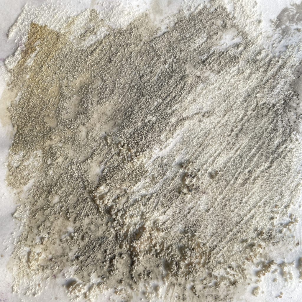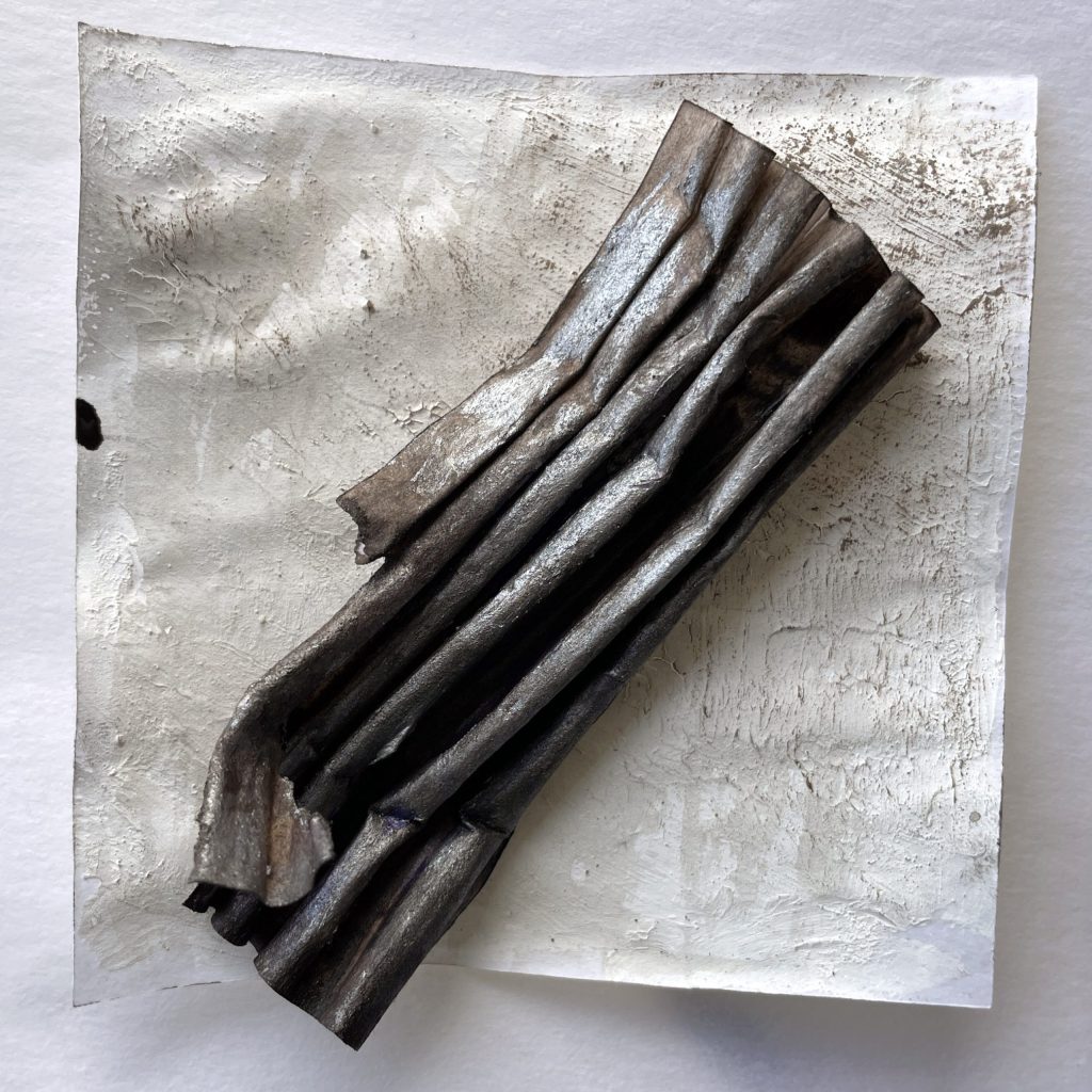 銀と茶色のアクリル絵の具で塗りました。紙面が強いので、重ね塗りや絵具の盛りにも耐えます。煙る空気感や、朽ちた質感も本物のよう。