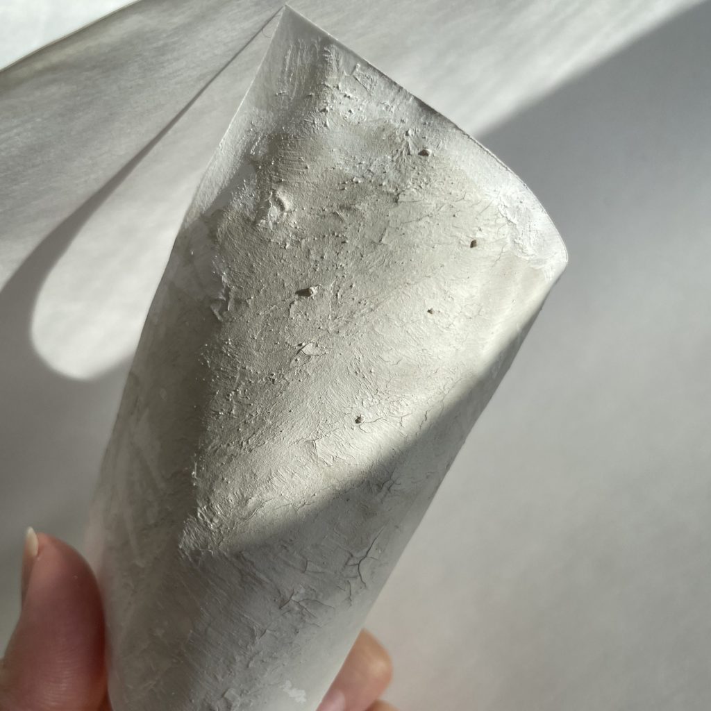 ミスティックペーパーは、木材パルプを原材料として作られた素材で、紙と似ていますが破れにくく、水につけるとやわらかくなり乾燥すると硬くもなる性質を持っています。
