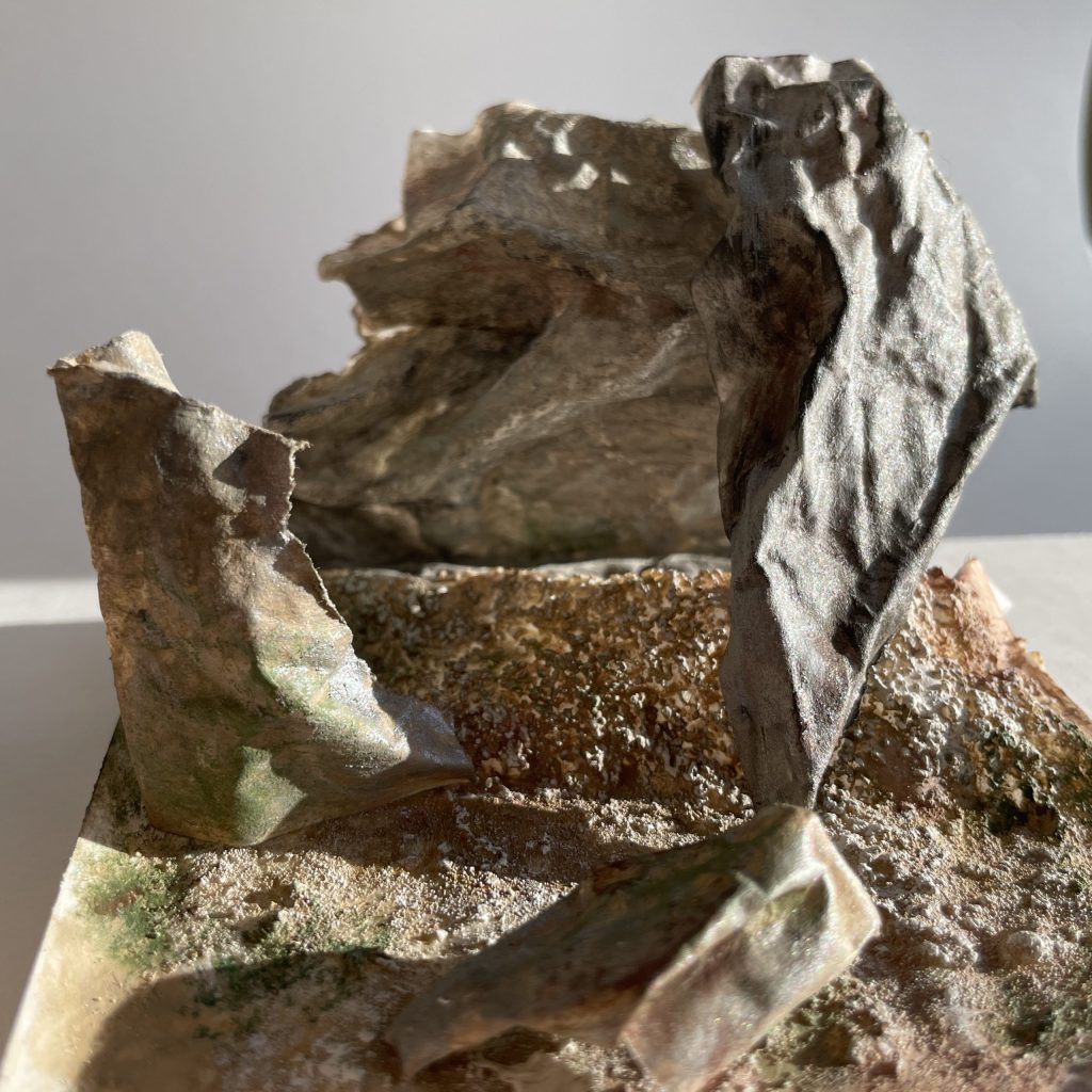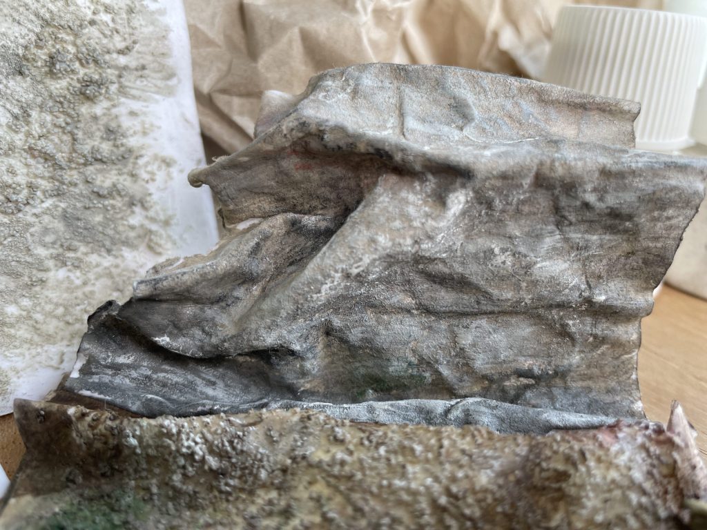 濡れた状態のミスティックペーパーをもみ込んで、紙自体に質感をつけたうえで着色しました。紙面が丈夫なので破けることなく、さらにざらざらとした岩の質感、積る土埃等、ディティールの描き込みも可能です。