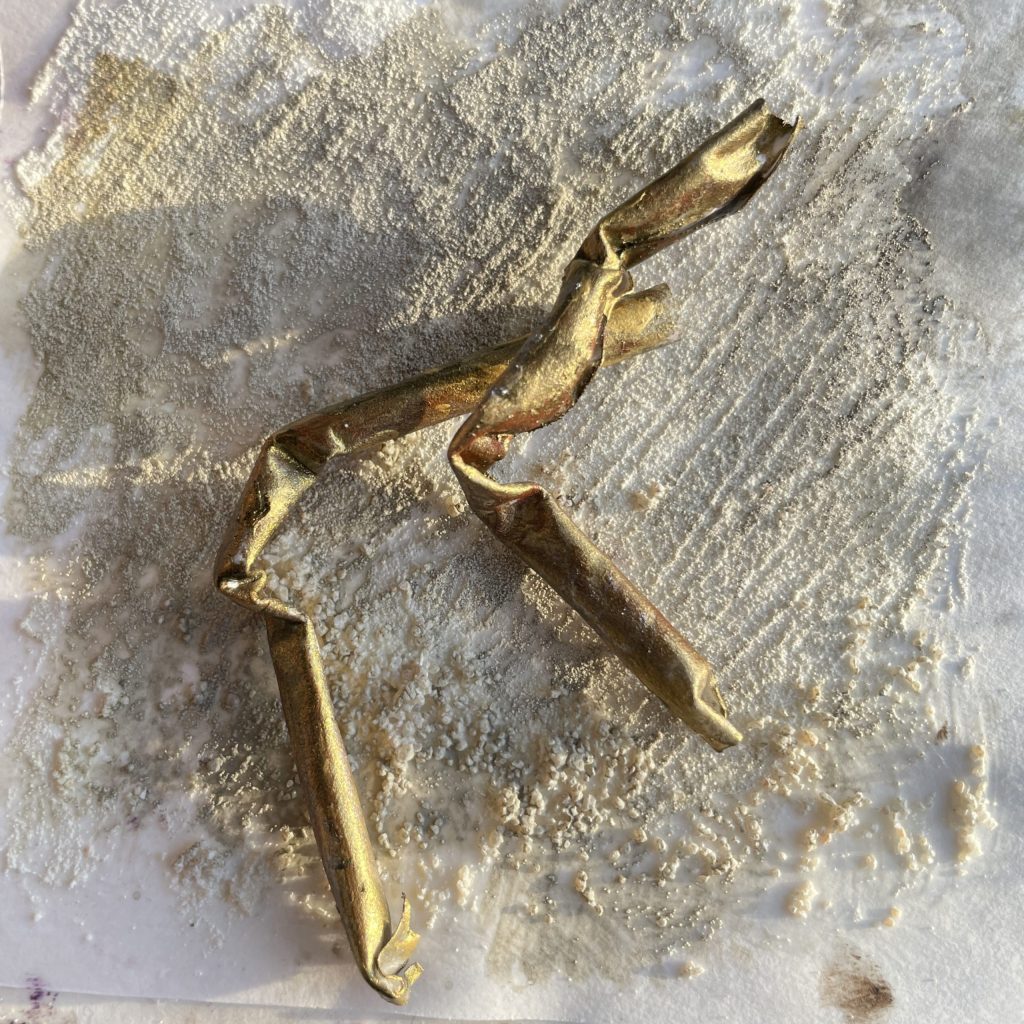 金のアクリル絵の具で塗った後、茶色で錆を表現しました。重厚感ある素材に見せることが可能です。