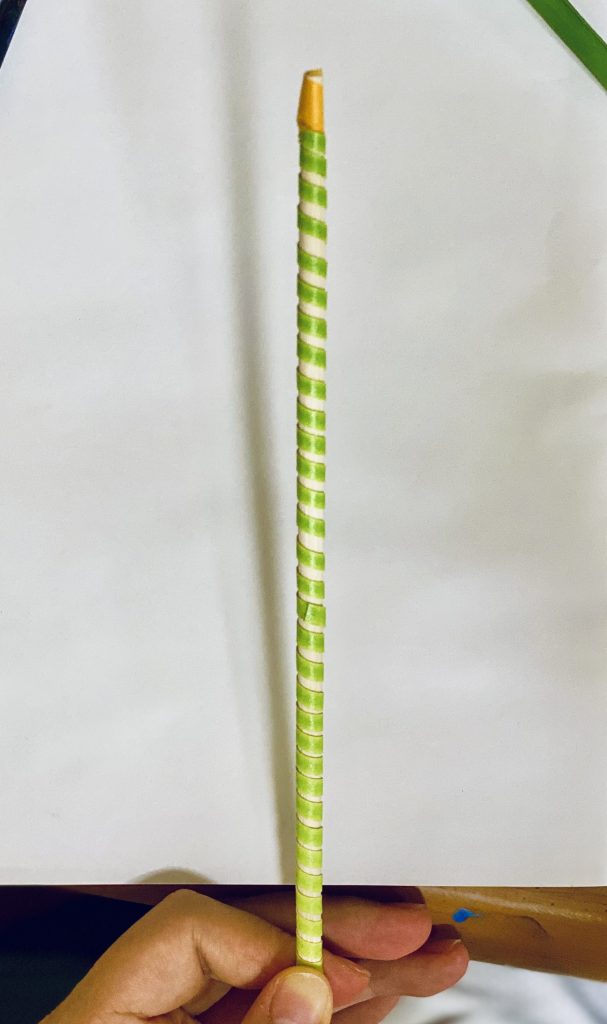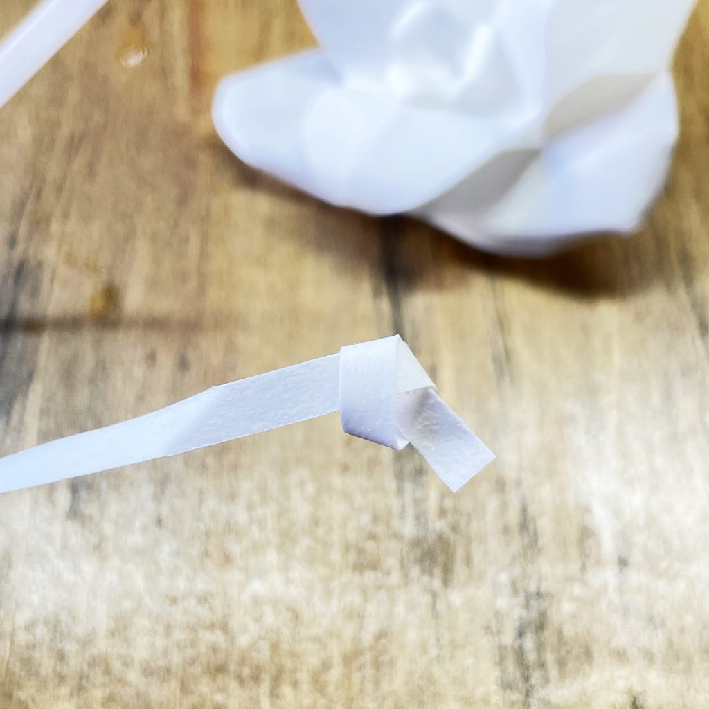 茎はしなやかさを出すため、紙を細長く切ります。針金や割り箸に巻いて形を作を作ります。乾いた後、中の芯を抜けば、その形のまま固定されます。