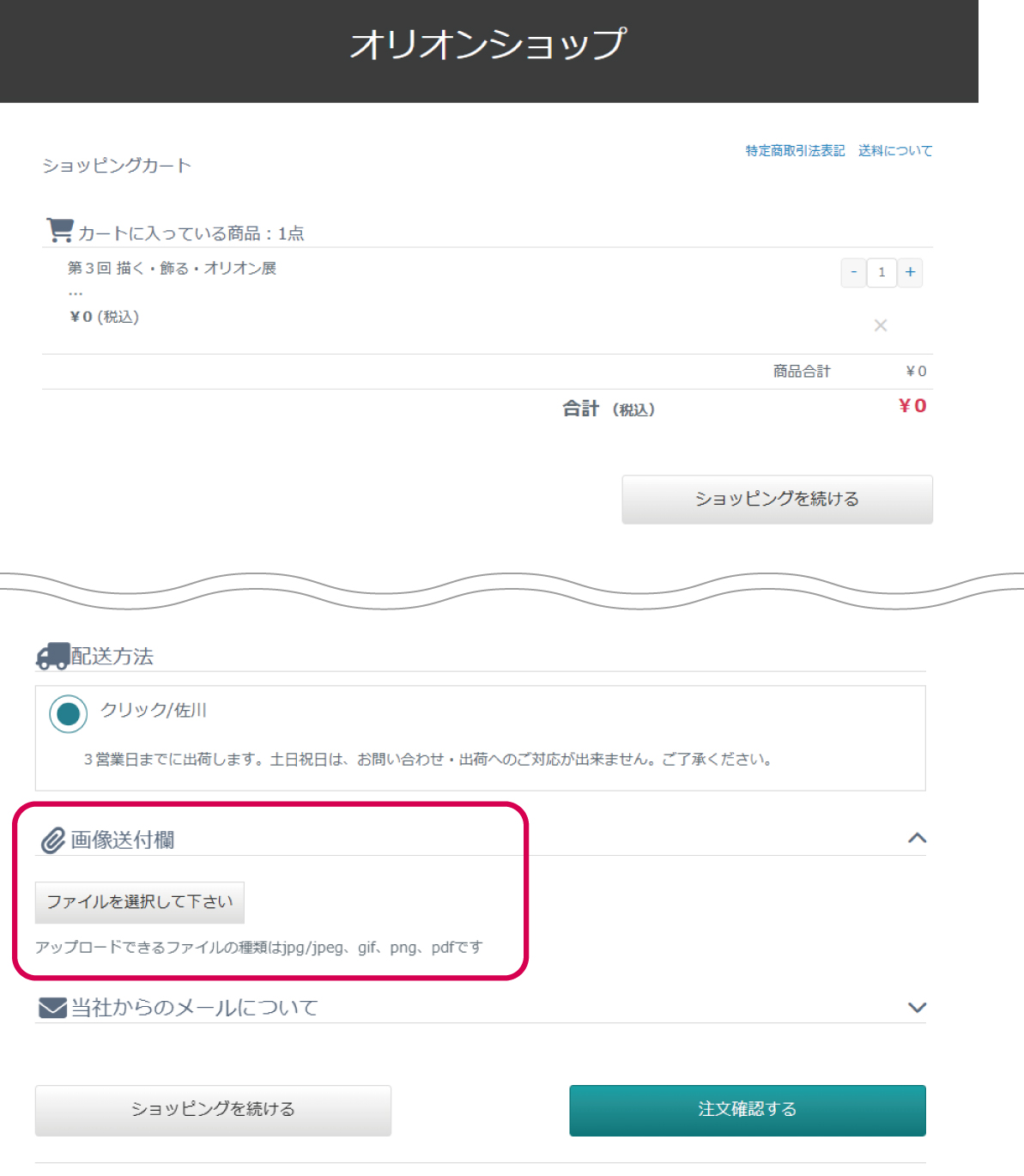 •システムの都合上、「配送方法」と「支払い方法」のチェック項目が表示されますが、そのまま【注文を確認】→【注文する】ボタンへとお進みください。