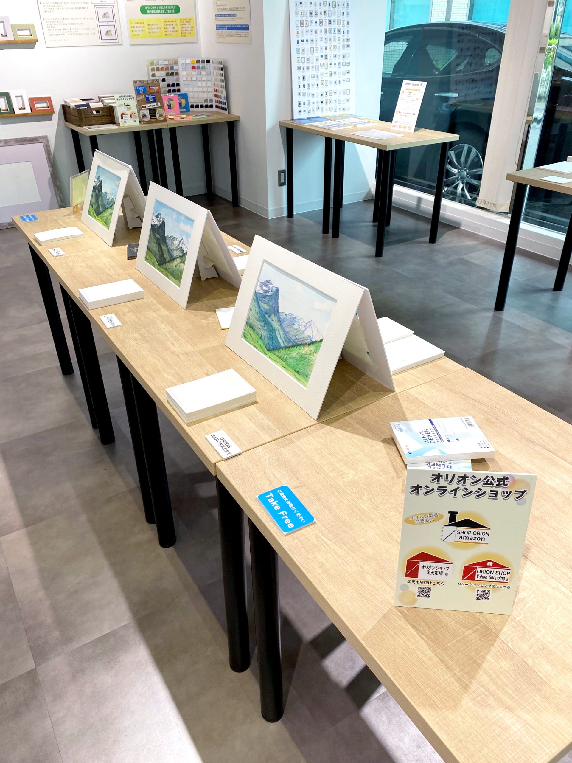 額装用マットで、ORION社員作の風景画を額装し展示しました。同じモチーフ・構図を描く事で、紙の特徴によっても表現の幅が大きく広がることをご覧いただきました。