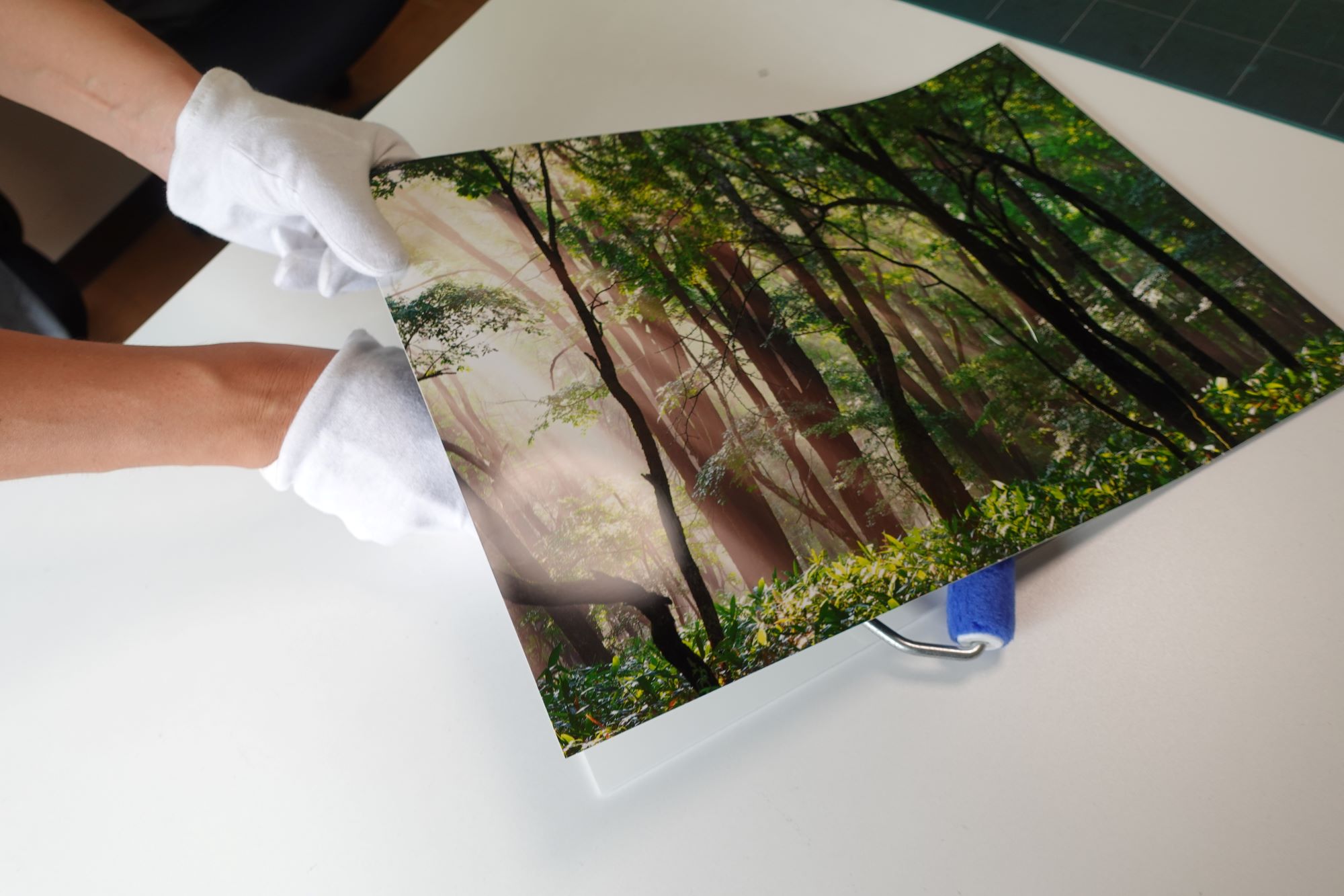 1 作品の端(角)から剥がしはじめます。 2 作品とパネルの間に間に手(もしくはローラー刷毛)を差し込み、持ち上げるようにして、 3 対角線上に向かってはがしていきます。