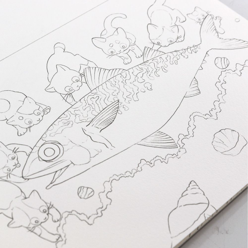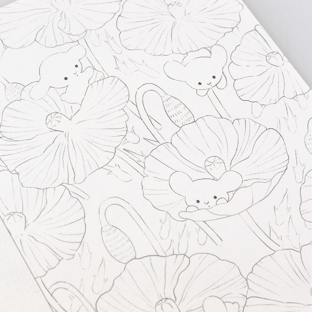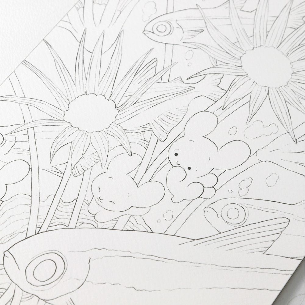 アクリルデネブは「細目」と「中目」を両面に組合せた紙ですが、今回の線画は「細目」側に印刷しております。着色は水彩絵具、アルコールマーカー、アクリル絵具、色鉛筆などにお使いいただけるおすすめ画材用紙です。