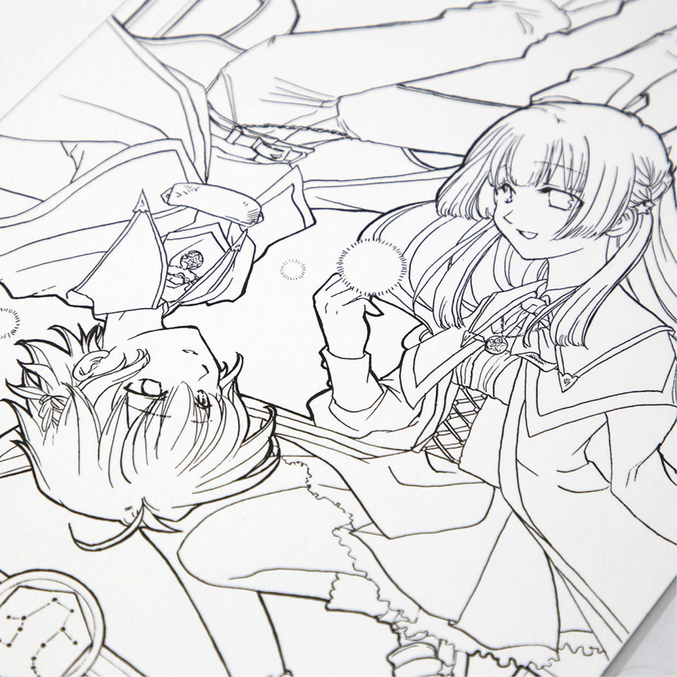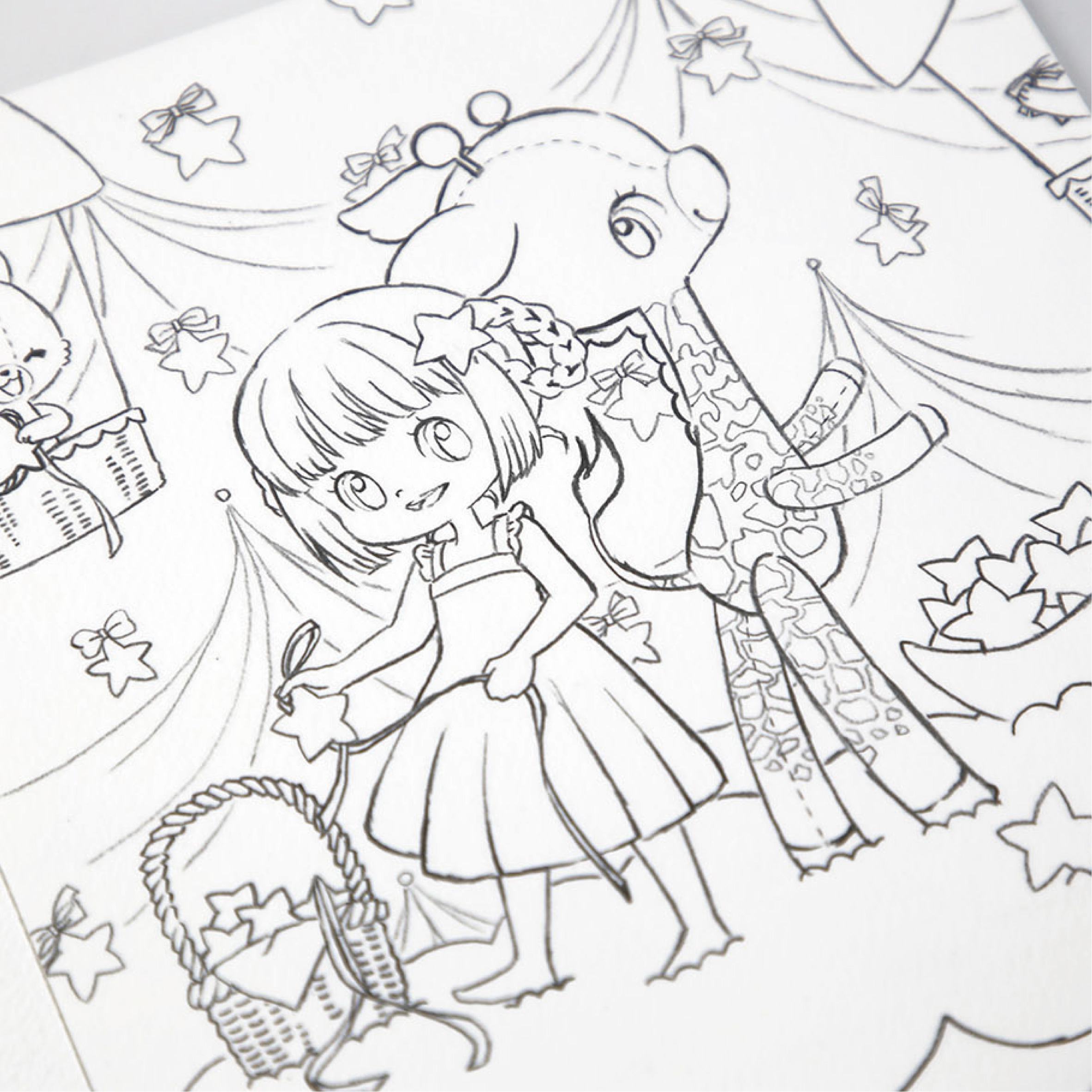 アクリルデネブ水彩紙は300g厚さ0.45mmあり、水彩・アクリル絵具・マーカー・色鉛筆などの描画材に適しています。 サイズは原画そのままのA4サイズで観賞用としてもお楽しみ頂けます。 アクリルデネブは「細目」と「中目」を両面に組合せた紙ですが、今回の線画は「細目」側に印刷しております。