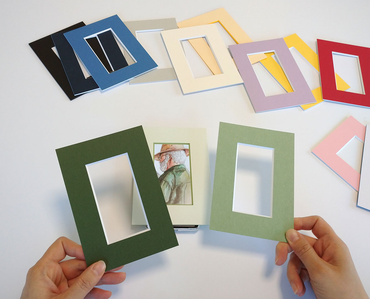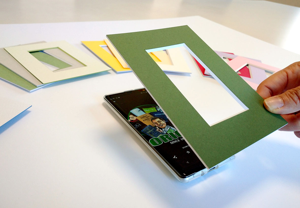 スマホに保存されている作品や写真を使って疑似マッティング。作品を持ち込まなくても作品と額縁マットのイメージが容易に出来ます。マットの色をたくさん試すことができ、作品に合った質感、カラーを見つけることが出来ます。カテゴリー数は全12種類!!