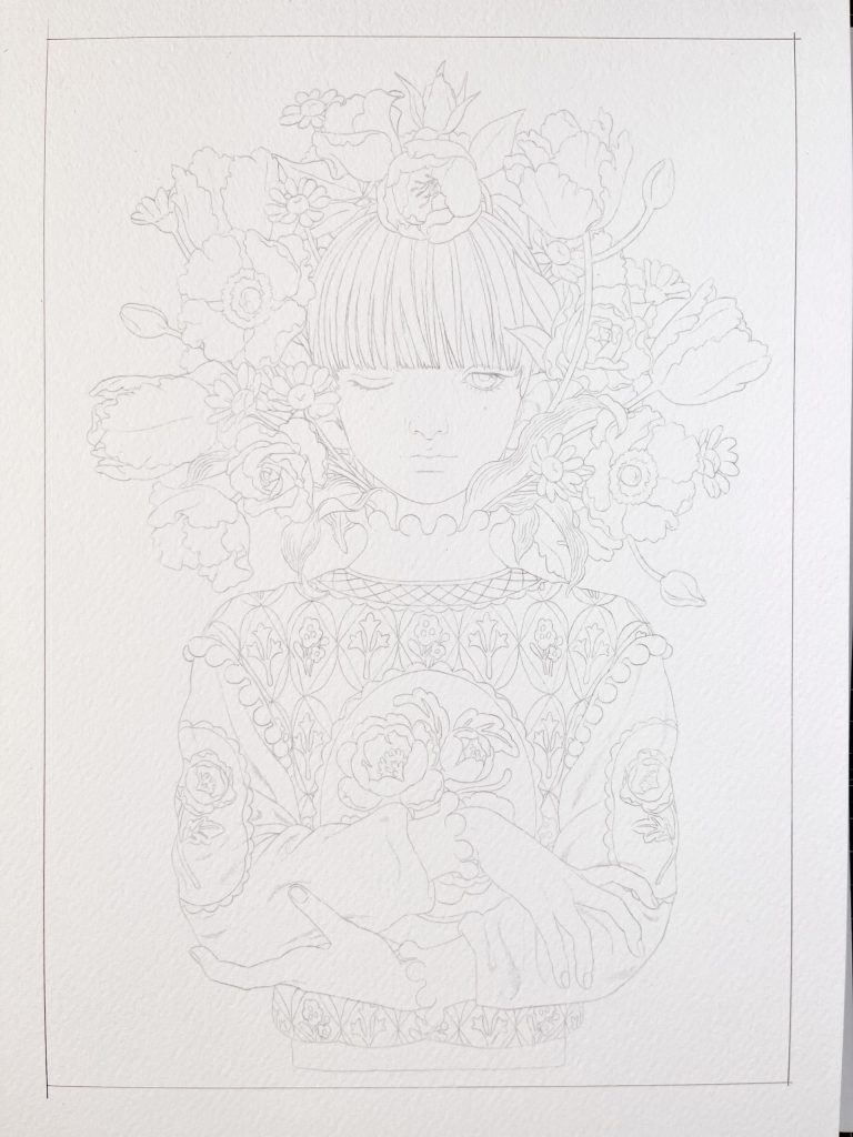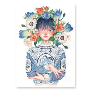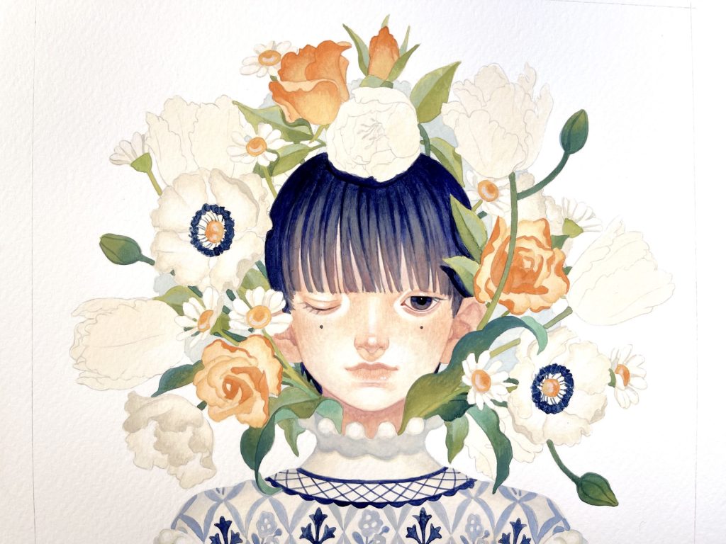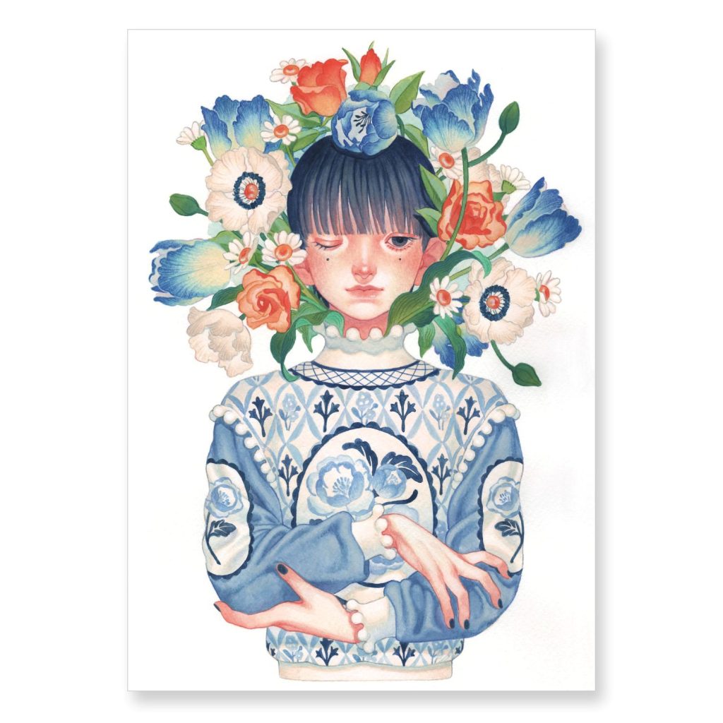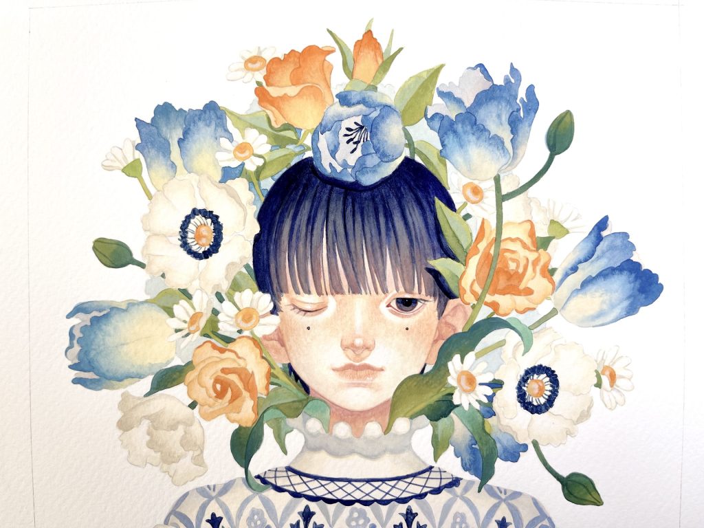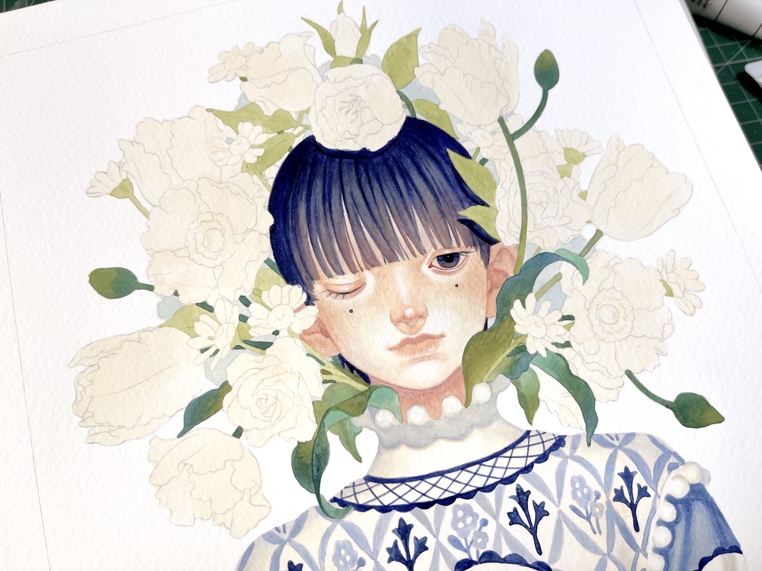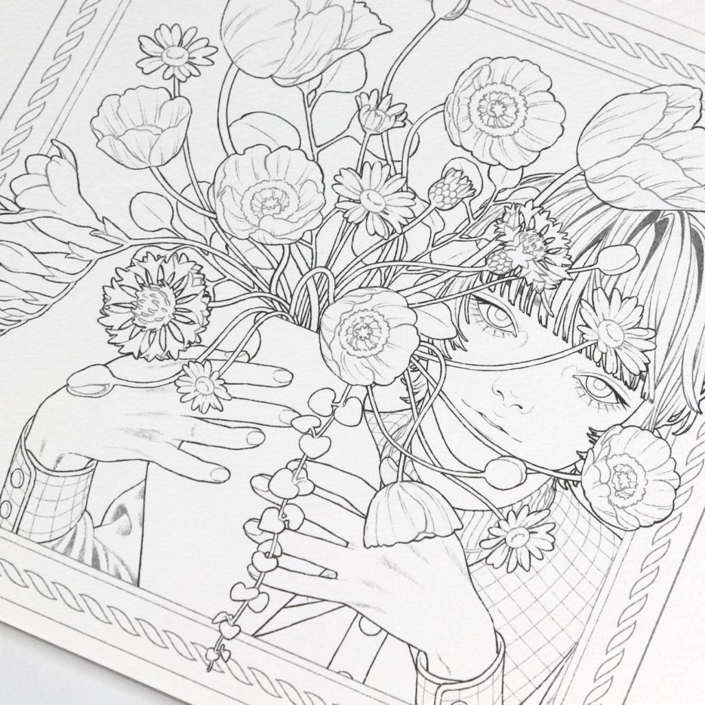 植物と、美しく可愛いらしい人物の組み合わせを好んでよく描いています。