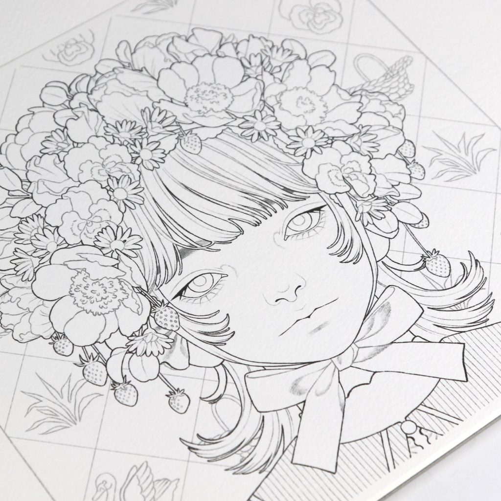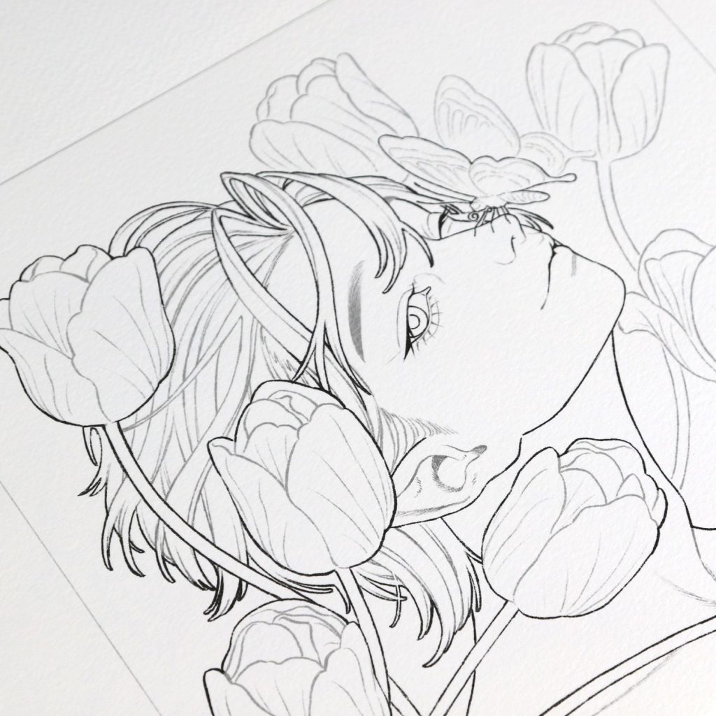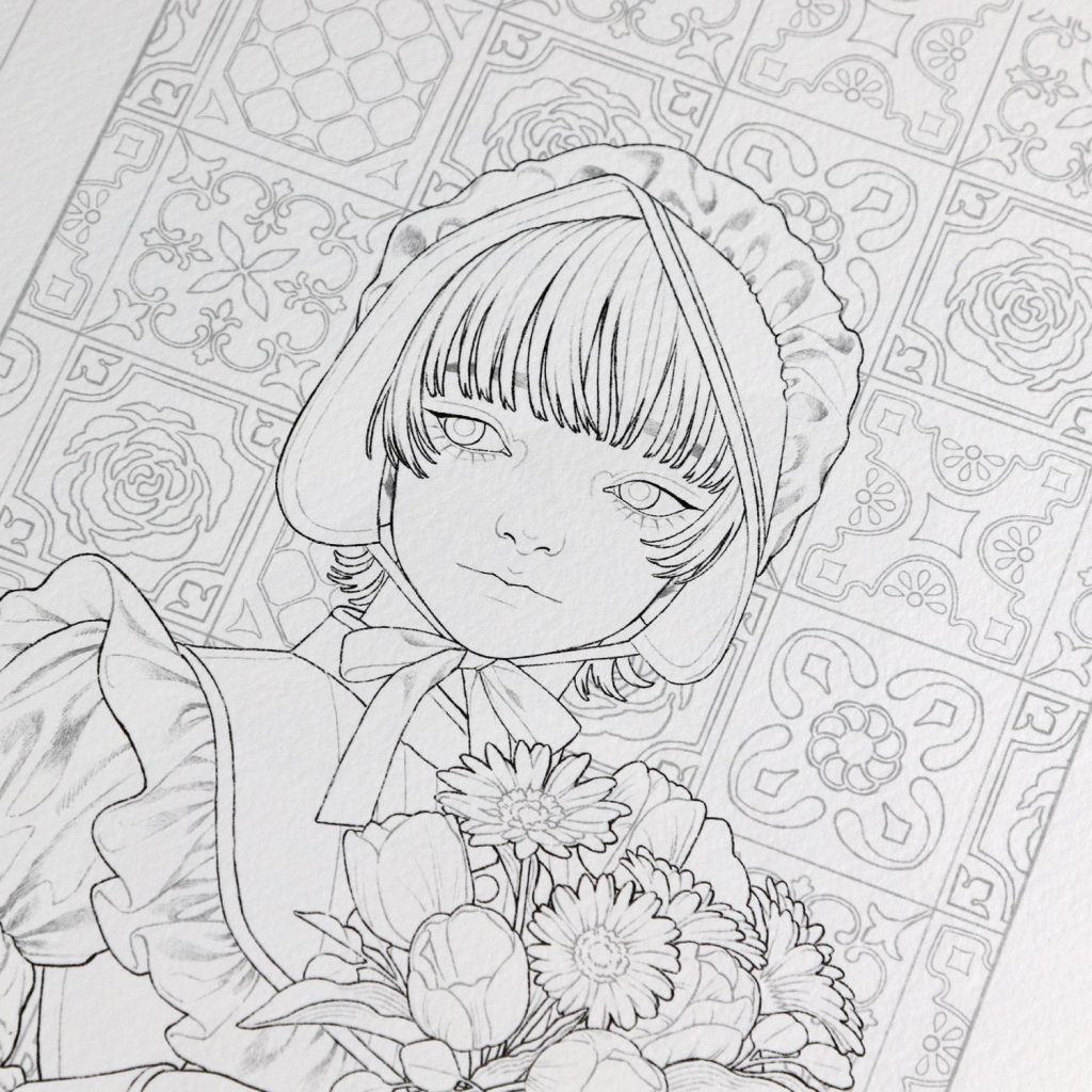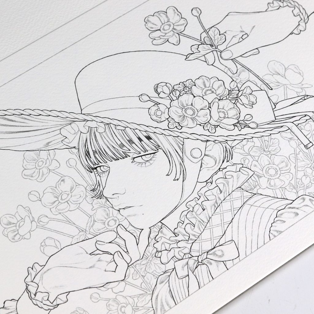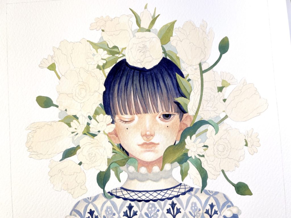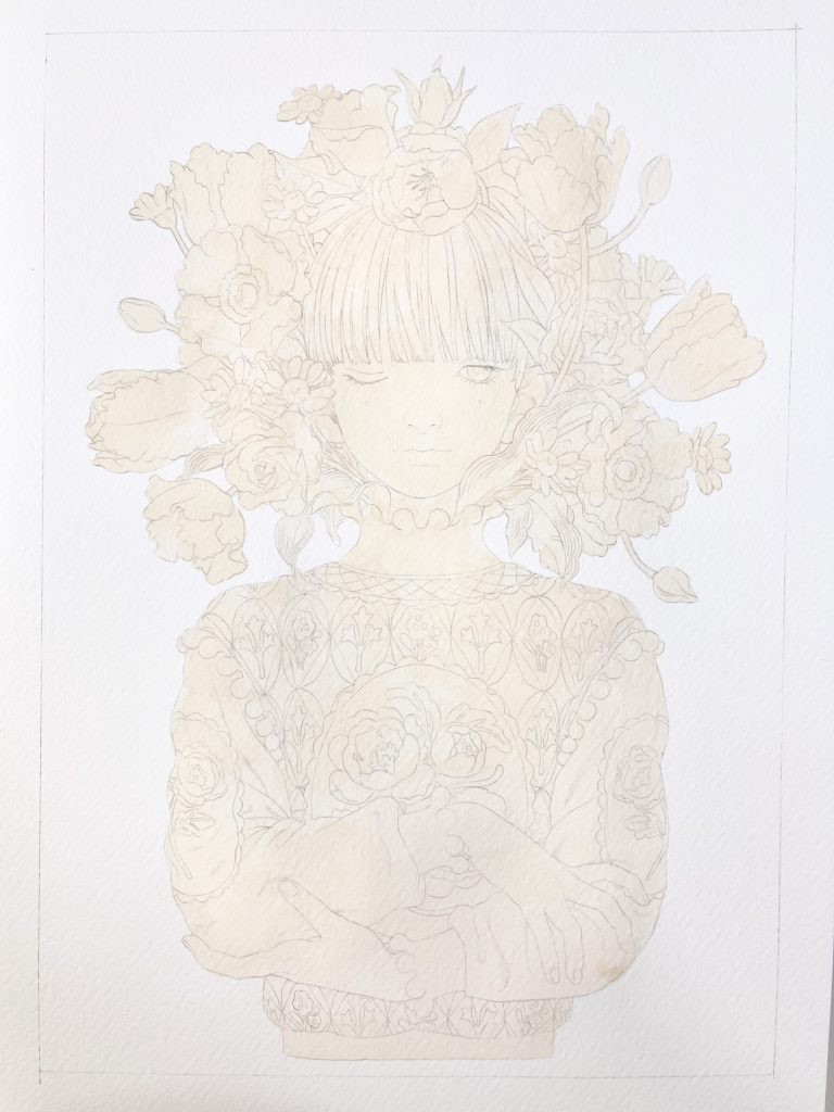 植物と、美しく可愛いらしい人物の組み合わせを好んでよく描いています。