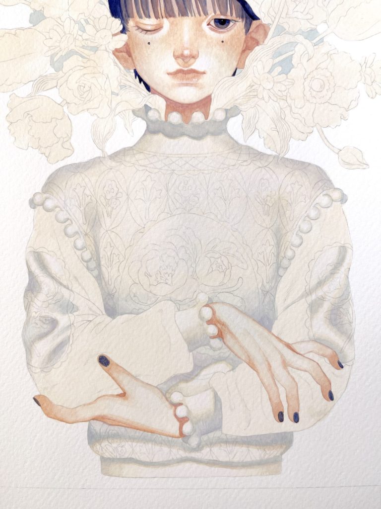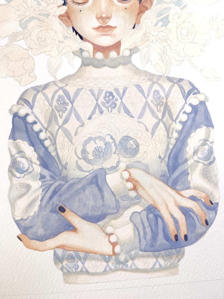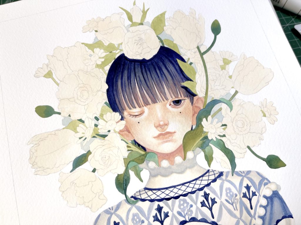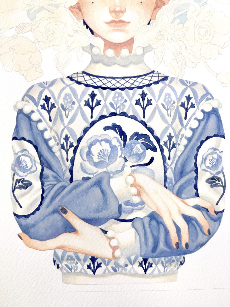 衣装は、シノワズリブルーの花瓶のイメージで彩色しています。