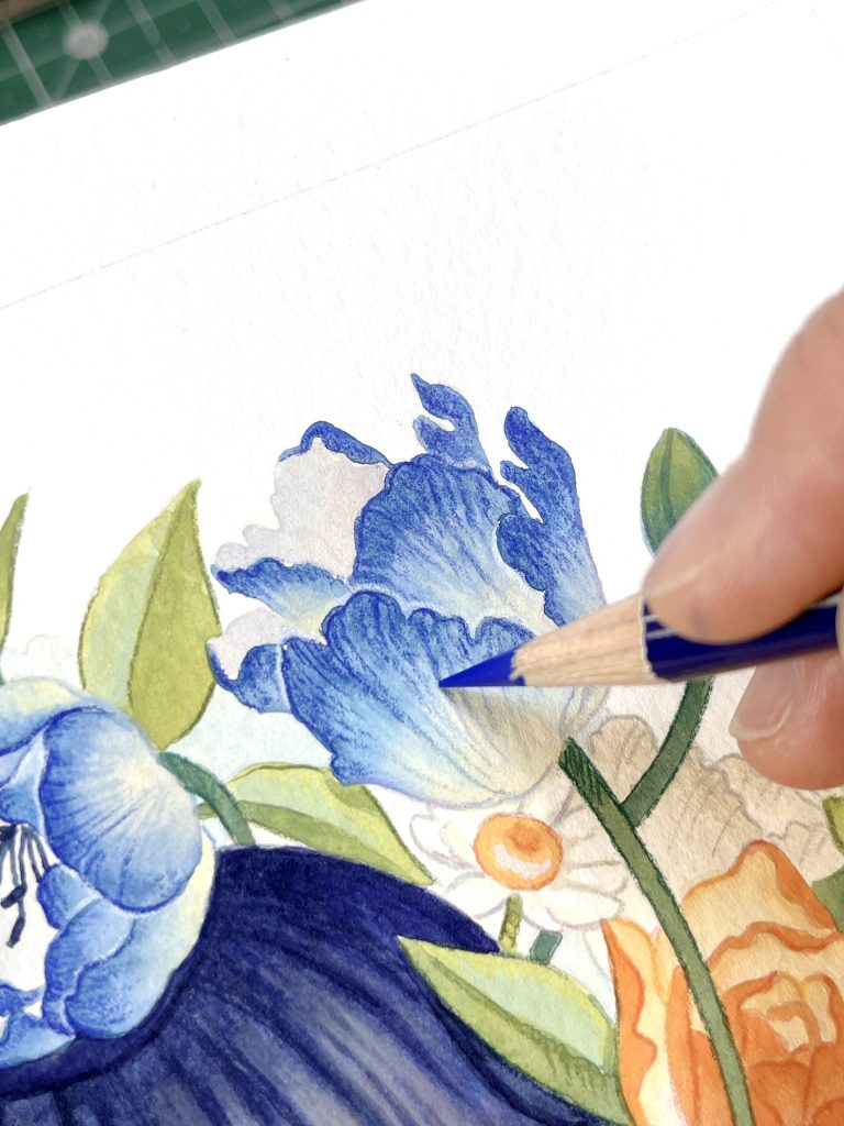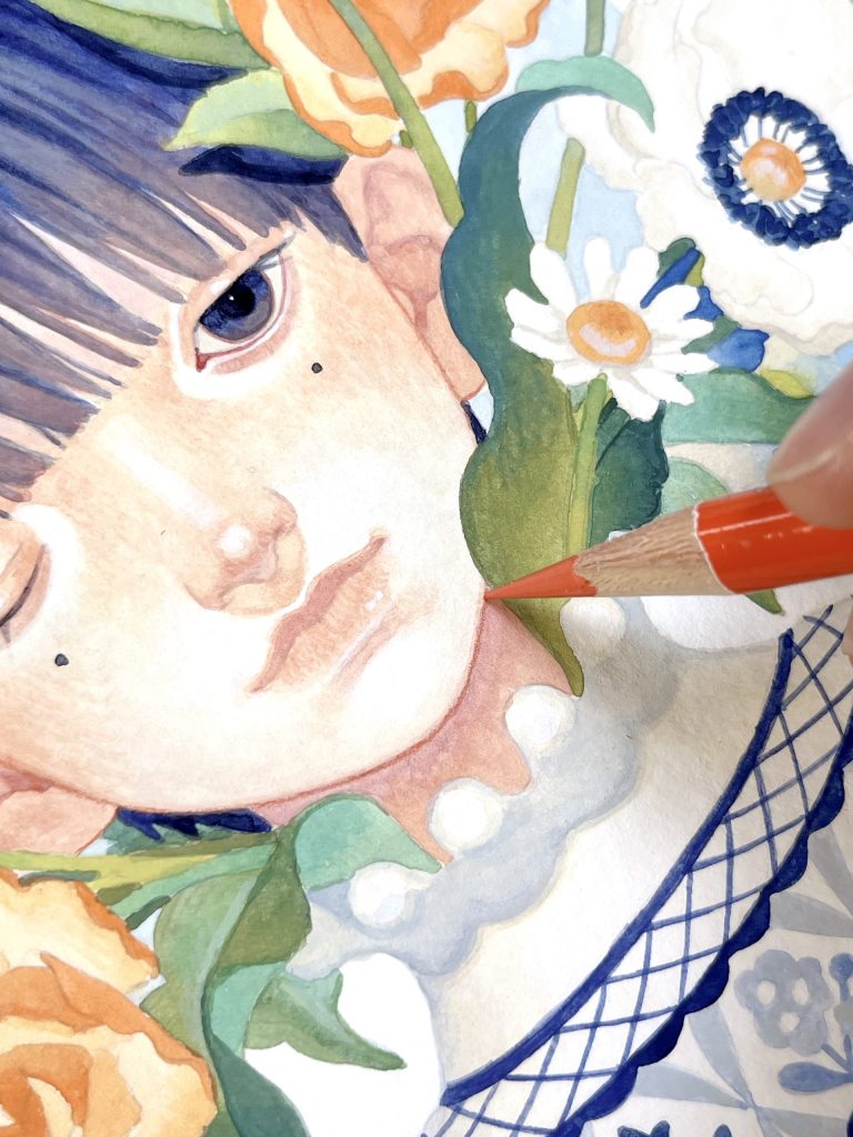 絵の具が完全に乾いたら、色鉛筆で仕上げをします。