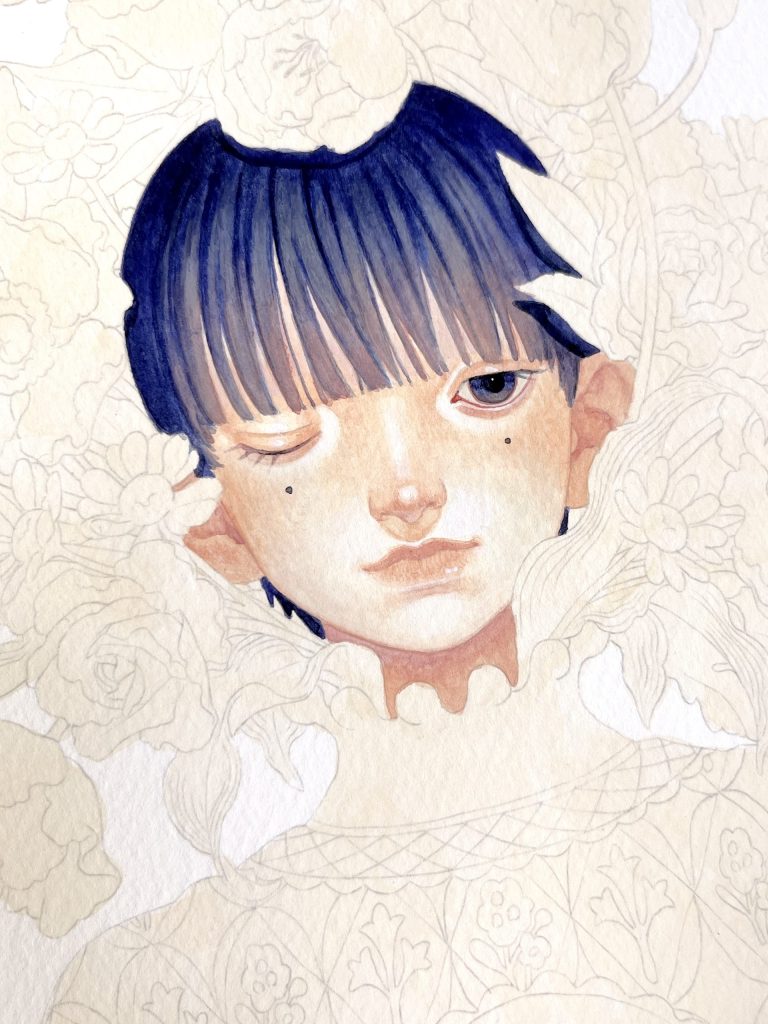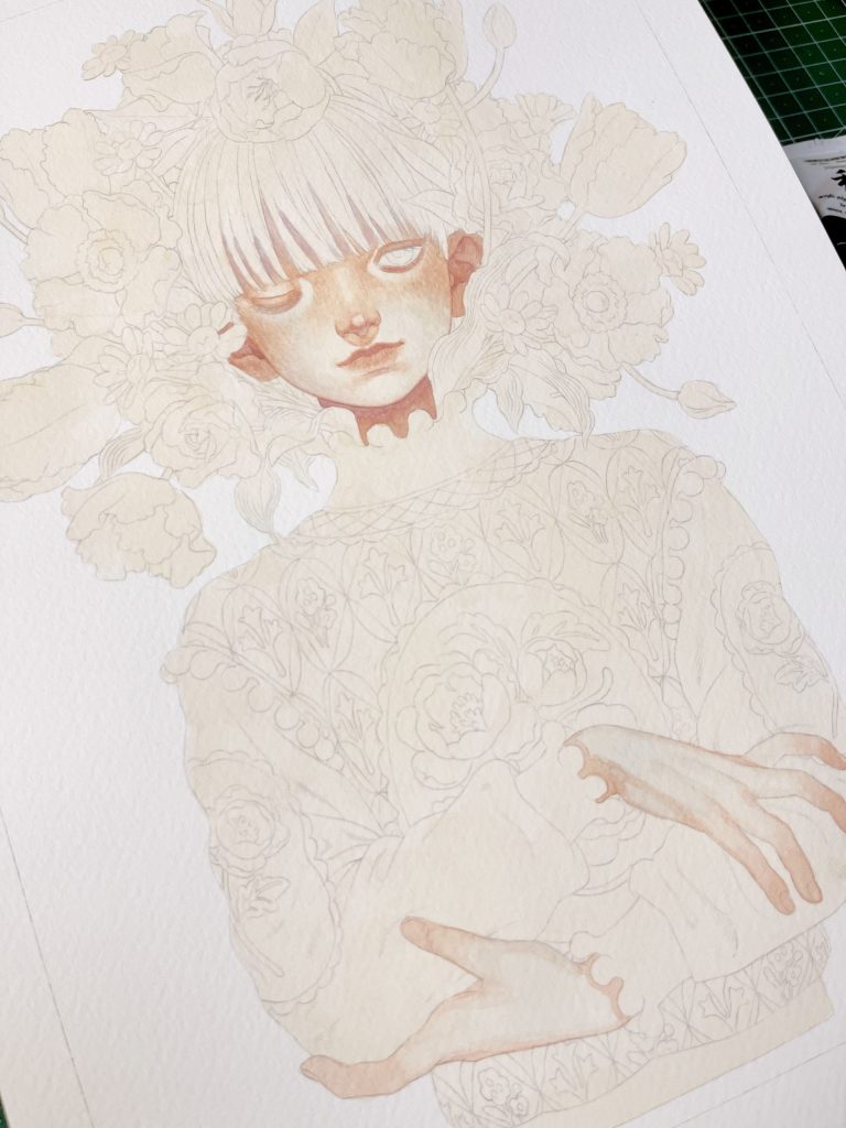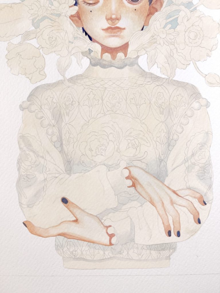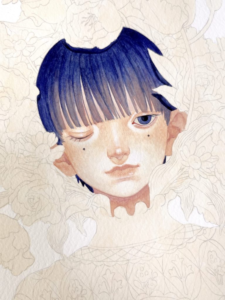 ある程度色を乗せたら、影やハイライトなどの細部を調整していきます。(アクリルガッシュは不透明且つ耐水性なので、暗い色の上に明るい色を乗せてもしっかり発色します)
